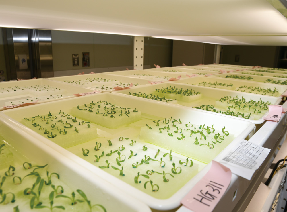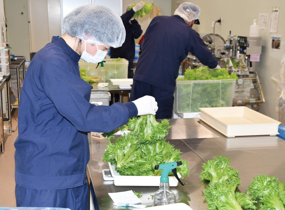 完全密閉型の無菌室を設置。栽培室は空調や湿度、二酸化炭素などコントロールが可能。作物の含有成分を光や水肥料、培養液などで調整しながら栽培し、パックを開けて、そのままお召し上がりいただけます。