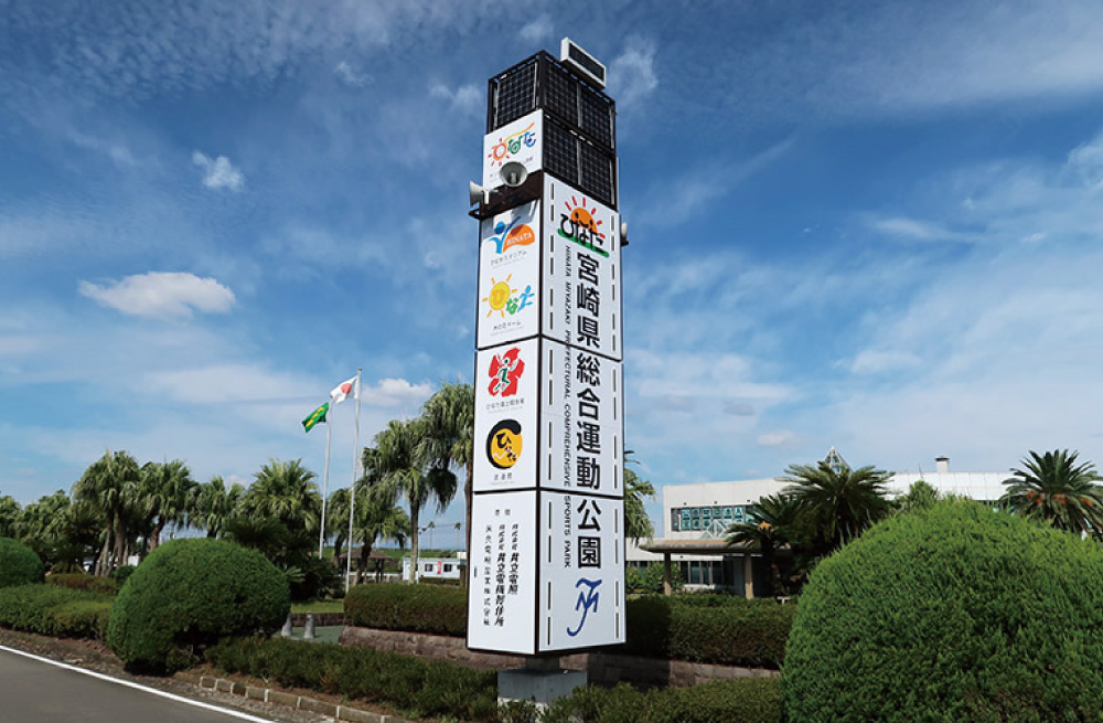 宮崎県総合運動公園に太陽光発電式LED照明付時計台3台を寄贈(2020年6月)
