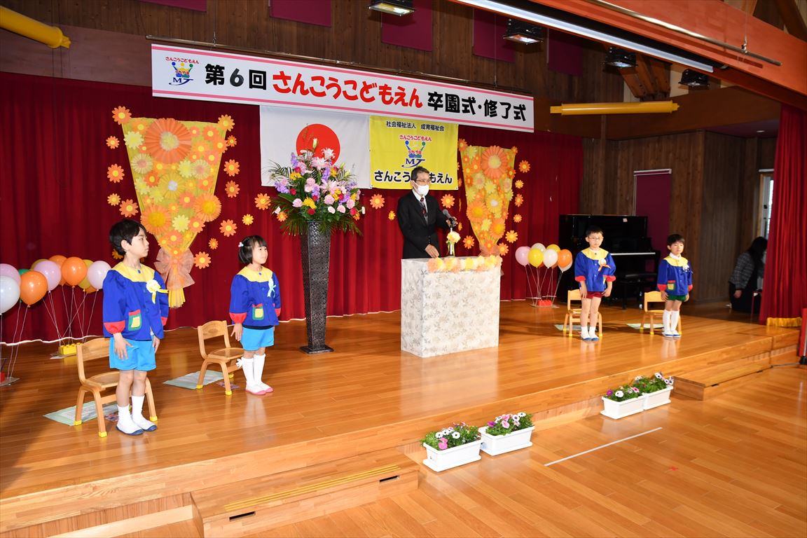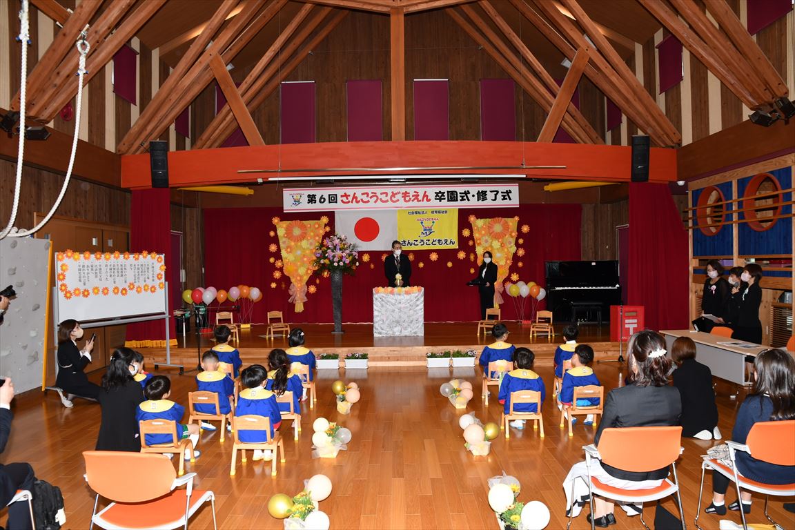 企業型立地保育園 さんこうこどもえん2022年度第6回卒園式が3月25日、宮崎市高岡町の同保育園に於いて開催されました。十二分な感染対策を施し、皆様のご理解を得て、今年度も式を行いました。