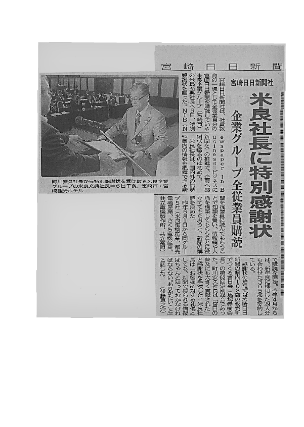 面社会欄に弊社社長 米良充典に感謝状授与の記事が掲載されました。