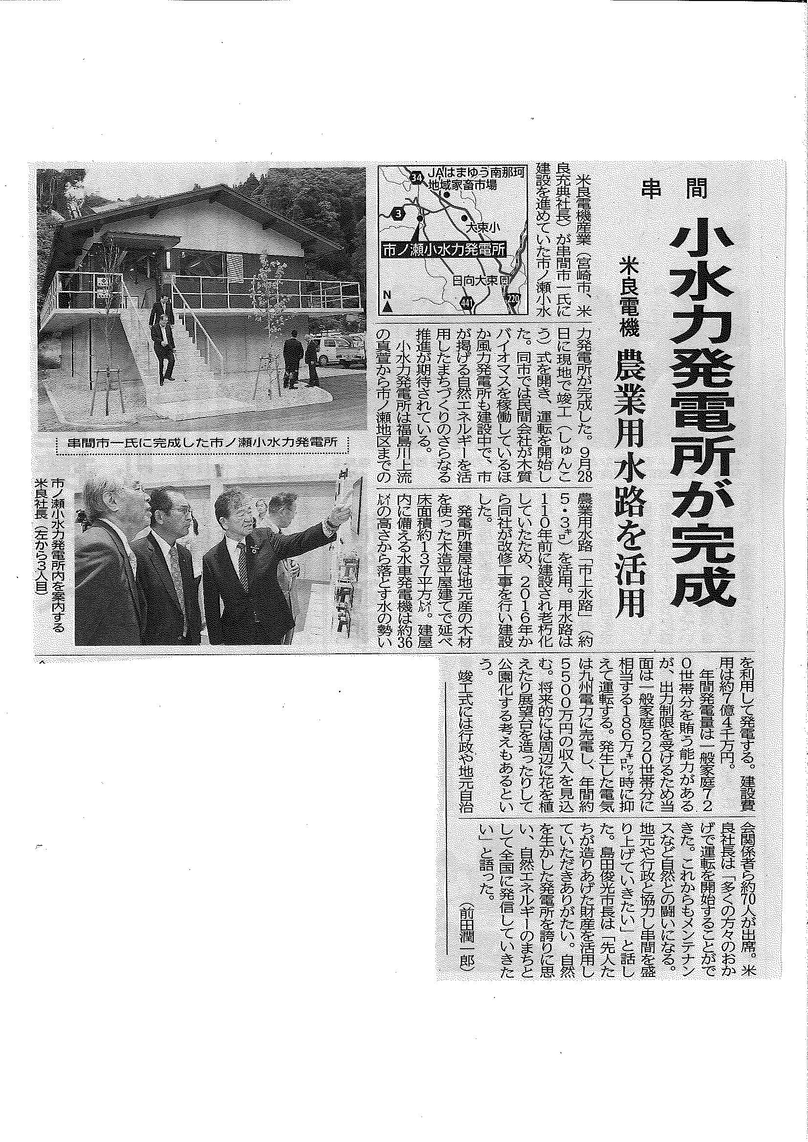 米良電機産業(株)が計画を進め、(株)ハイドロクリーン21が事業代行をしました串間市内の小水力発電所が、 このほど完成いたしました。