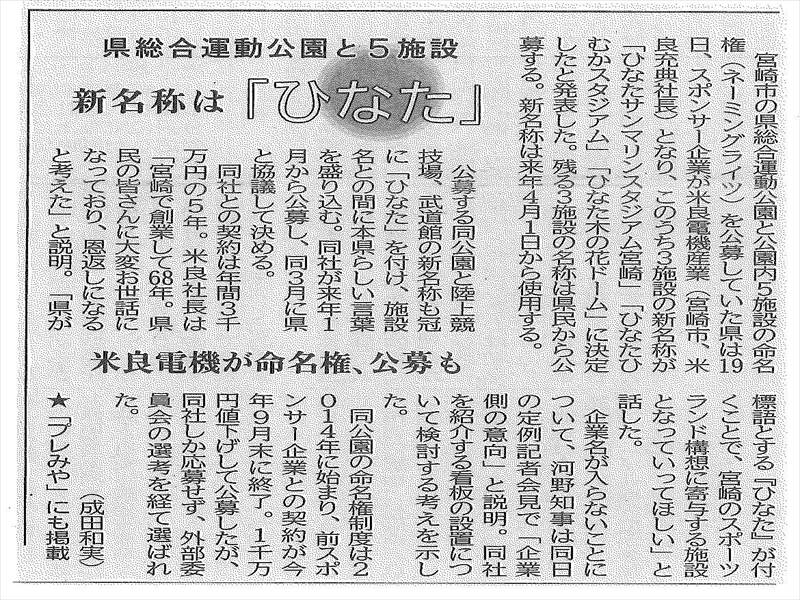 令和元年12月20日(金)付け宮崎日日新聞1面に(株)米良電機産業が県総合運動公園と公園内の5施設の命名権を取得した記事が掲載されました。