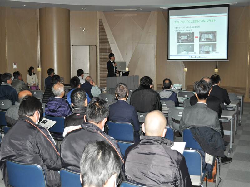事前に応募のあった6者が新工法及び新製品等に関するプレゼンテーションを実施。弊社は、既存のハウジングをそのまま活用し、光源のみをLEDに交換する「エコ・リメイクLEDライト」の概要や期待される効果などを紹介し、経済性や取付時の安全性が大幅に向上することをPRいたしました。