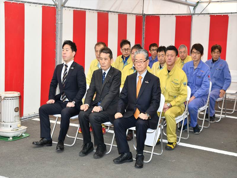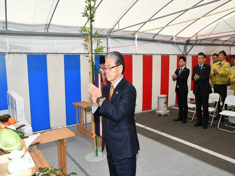 安全祈願祭では、米良 充典社長、施工者を代表して佐野 雅彦日鉄エンジニアリング(株)九州支社長ほか2名の方が玉串を奉奠していただきました。米良 充典社長は「今日、この第5期工事の起工式を迎えられて皆様に感謝しています。これにより今まで以上に生産性の効率を図り、職場環境を整えていきます」と挨拶。また、「各工事の施工担当者は安全を十二分に配慮し、事故がないように!この美しい高岡の環境を守りながら工事を進めていただきたい」と呼びかけました。