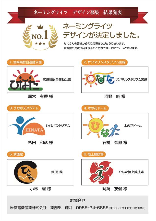 昨年12月、宮崎県総合運動公園と公園内の5施設の命名権(ネーミングライツ)のスポンサー企業に(株)米良電機産業が 決定したことを受け、弊社は、これらの施設の看板デザインを、本県在住の方を対象に、一般公募を行っていました。