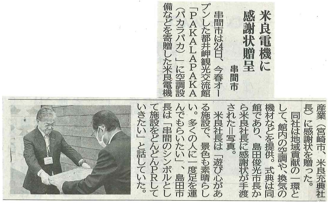 11月25日(水)付け宮崎日日新聞21面地域統合の欄に串間市から感謝状をいただいた記事が掲載されました。