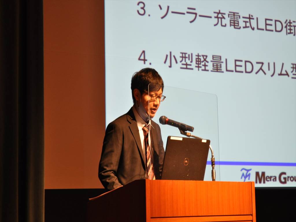 弊社の新技術・新工法プレゼンテーションでは、LED照明の導入実績のほか、既存のハウジングをそのまま活用し、光源のみをLEDに交換するエコ・リメイクLEDライトのメリット、新たにNETISに登録されたソーラー充電式LED街路灯(恵みの光)や、小型軽量LEDスリム型トンネル灯(天の川)の特長などをPRしました。