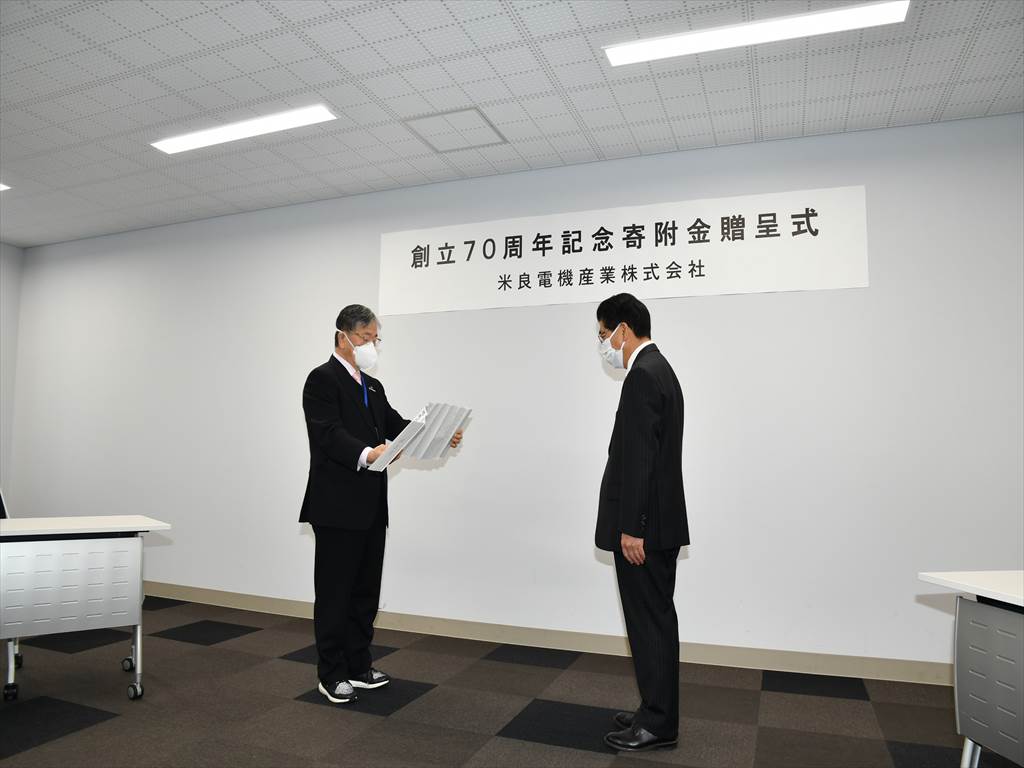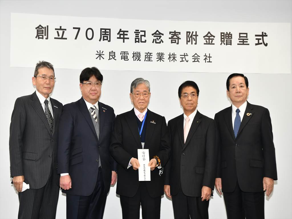 米良電機産業(株)(米良充典代表取締役社長)は、当社の創業70周年を記念して、県内の各市町村に寄附金70万円を贈りました。1月28日に宮崎市内の自治会館で贈呈式を行い、市町村を代表して出席した宮崎県市長会の戸敷正会長、宮崎県町村会の黒木定藏会長に対して、米良社長が目録を手渡しました。