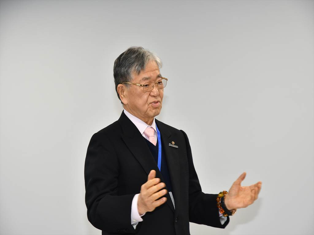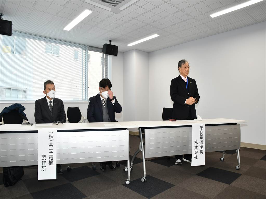 写真は贈呈式と挨拶する米良 充典社長です。
