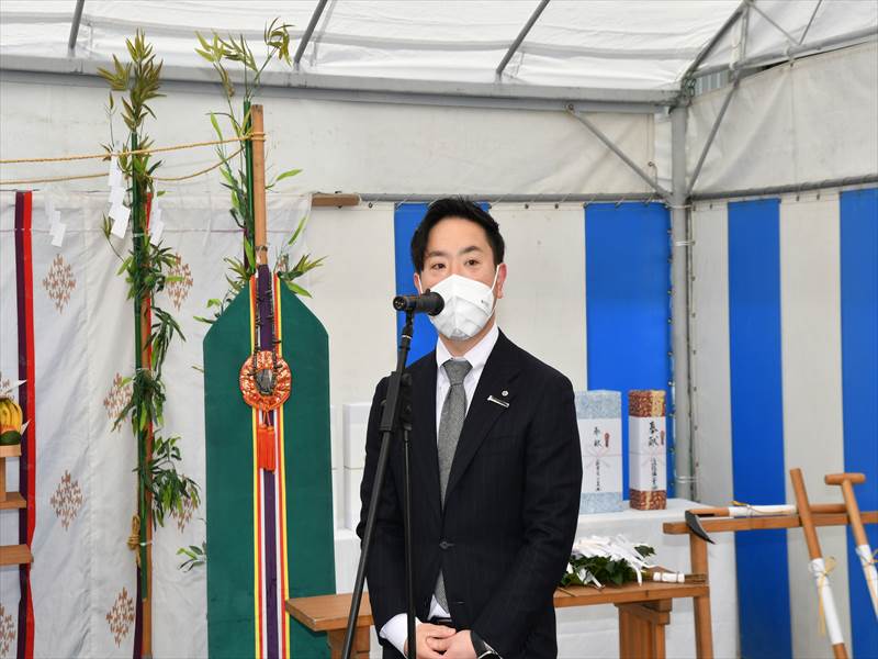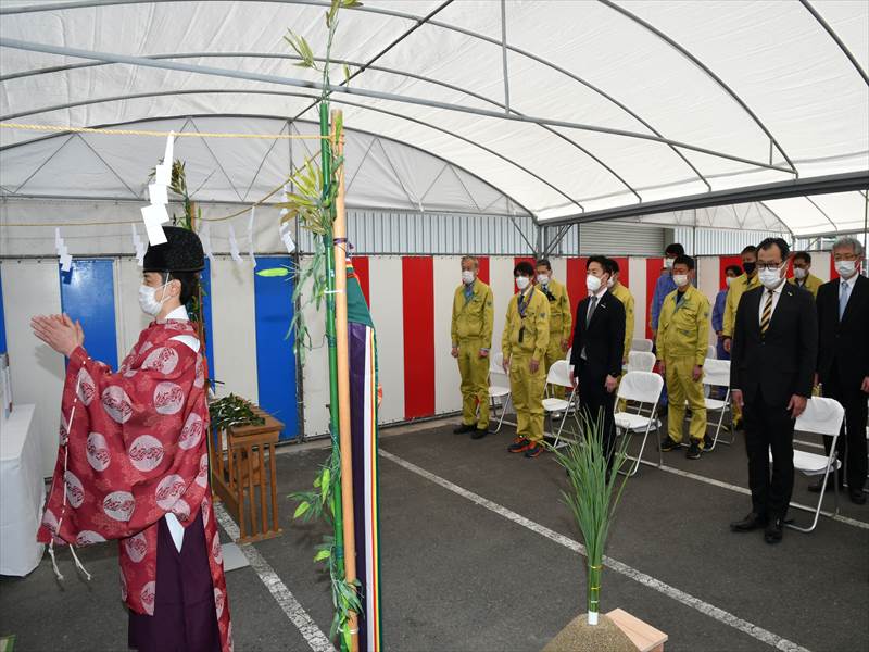 起工式では、共立電機製作所副社長米良充朝をはじめ、施工者を代表して坂口建設(株)社長松岡重孝様、三桜電気工業(株)常務取締役黒木勝則様、江坂設備工業(株)社長鳥山貴生様、日鉄エンジニアリング(株)九州支店長森幸喜様が玉串を奉奠しました。米良充朝は「第6期工事の起工式を迎えられて皆様に感謝しています。今まで以上を創るをテーマに、生産性の効率を図り、職場環境を整えていきます」と挨拶。また、「各工事の施工担当者様は安全を十二分に配慮し、事故がないように。この美しい高岡の環境を守りながら工事を進めていただきたい」と呼びかけました。