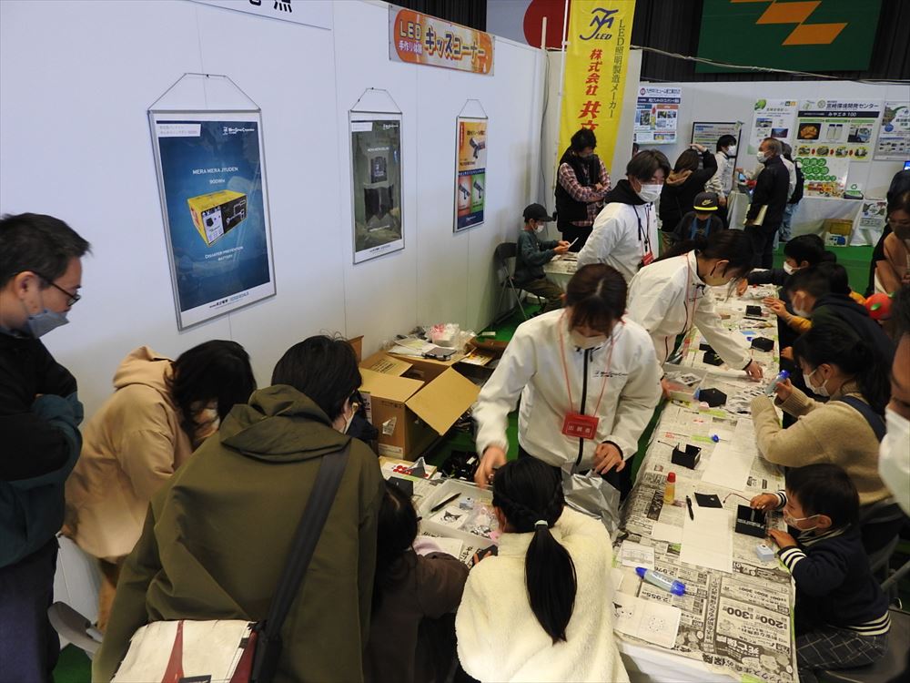 (株)共立電照は、11月17日と18日の2日間、宮崎県体育館で行われた「みやざきテクノフェア」にブースを出展しました。近年、重視されている防災への取り組みとして、ソーラー充電式LED街路灯や持ち運びできる折りたたみ式のバッテリー製品を展示したほか、子ども向けのLEDオブジェ製作体験を行いました。