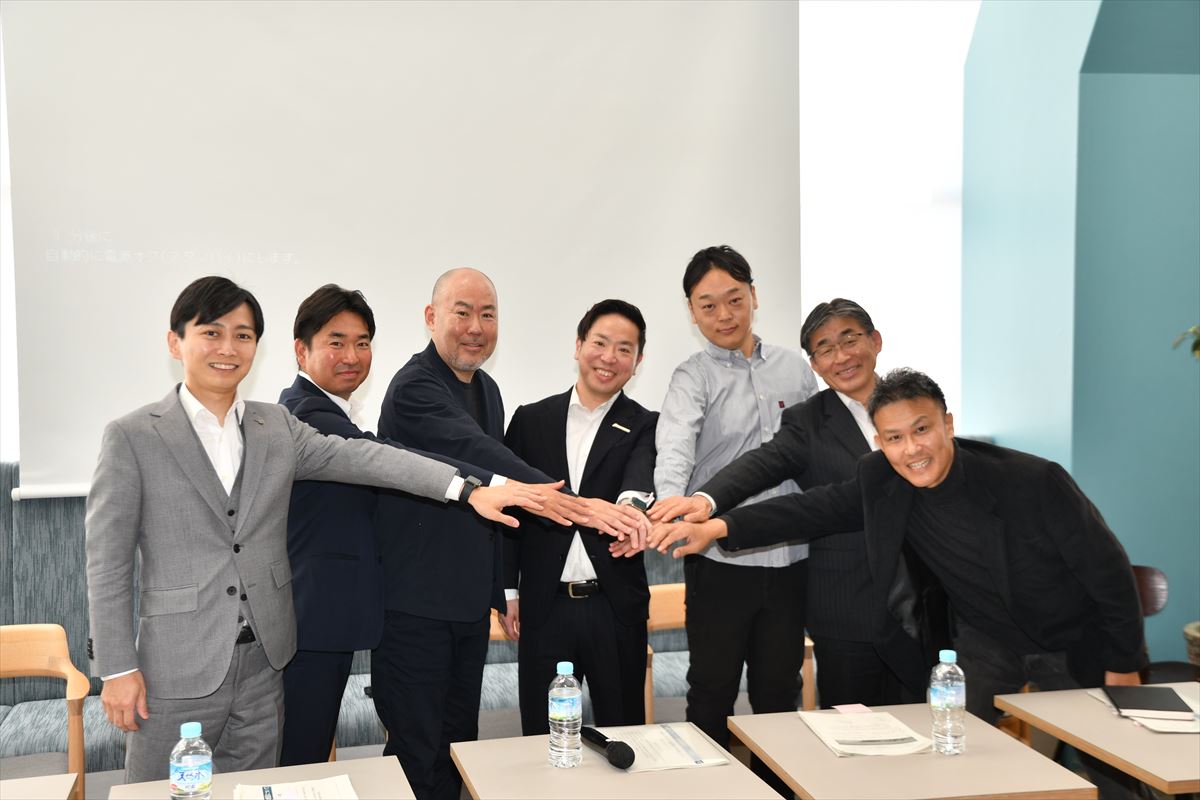 写真は、清山宮崎市市長をはじめ、弊社社長米良充朝、発起人の方々と会見の模様です。