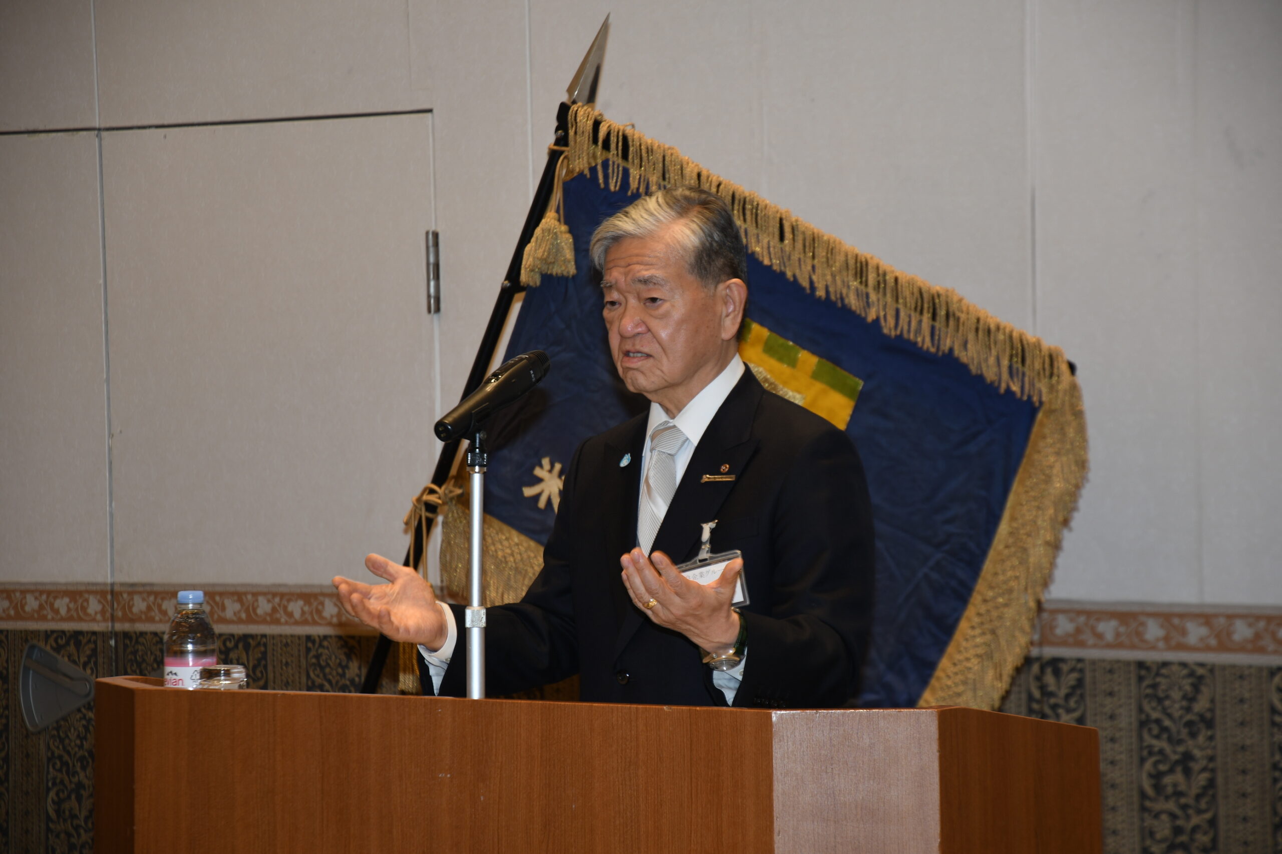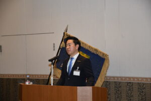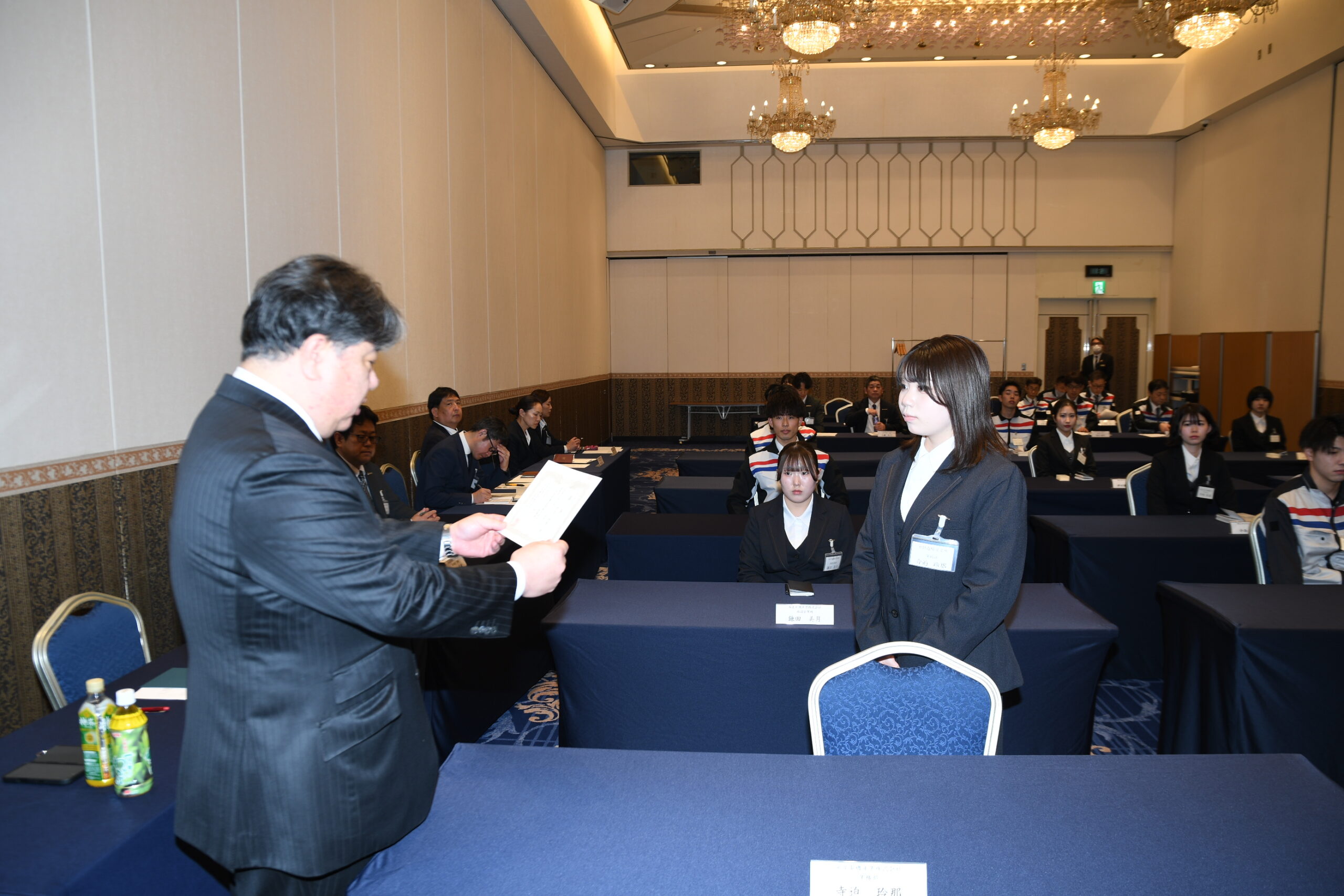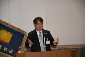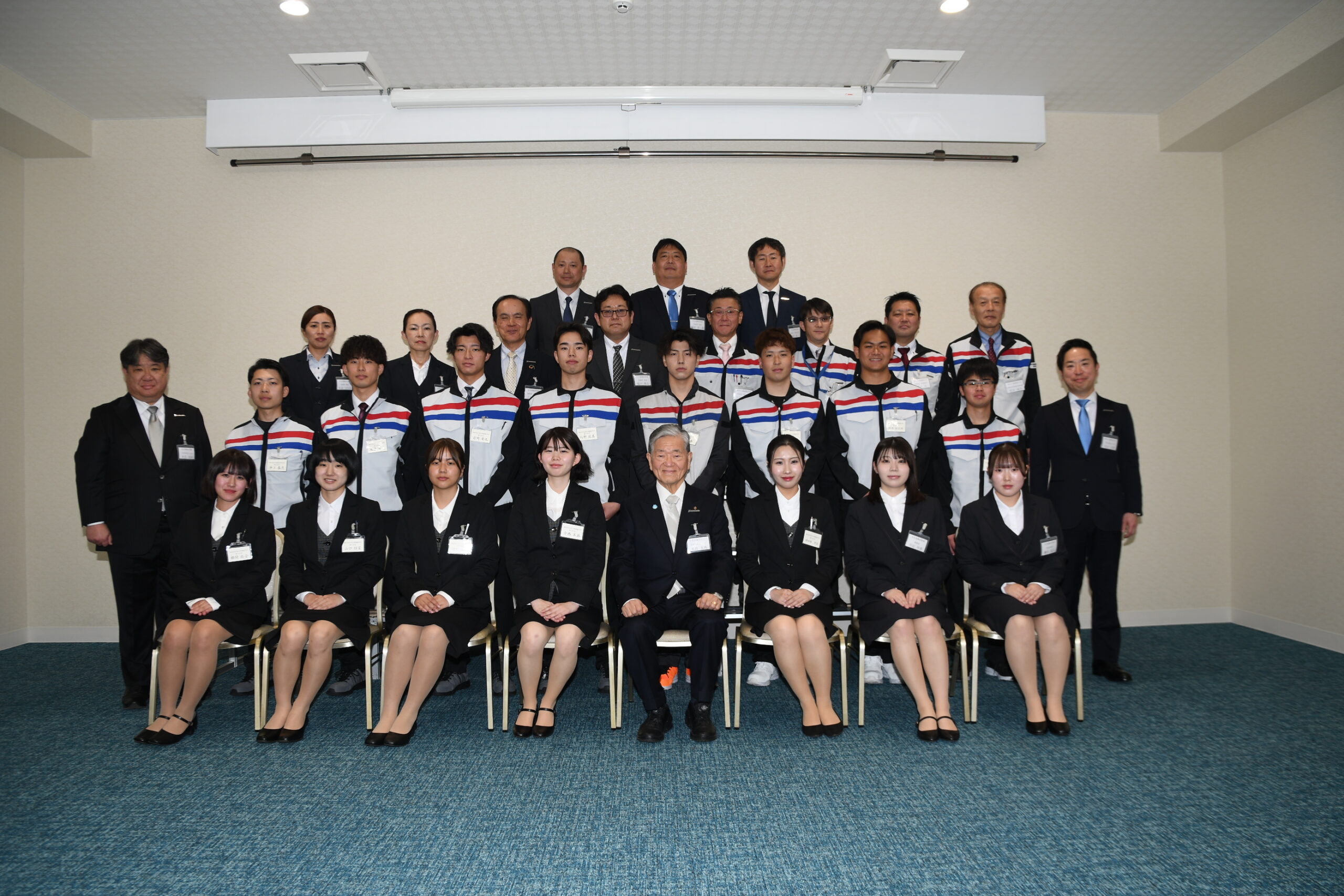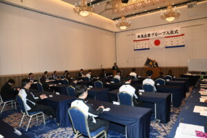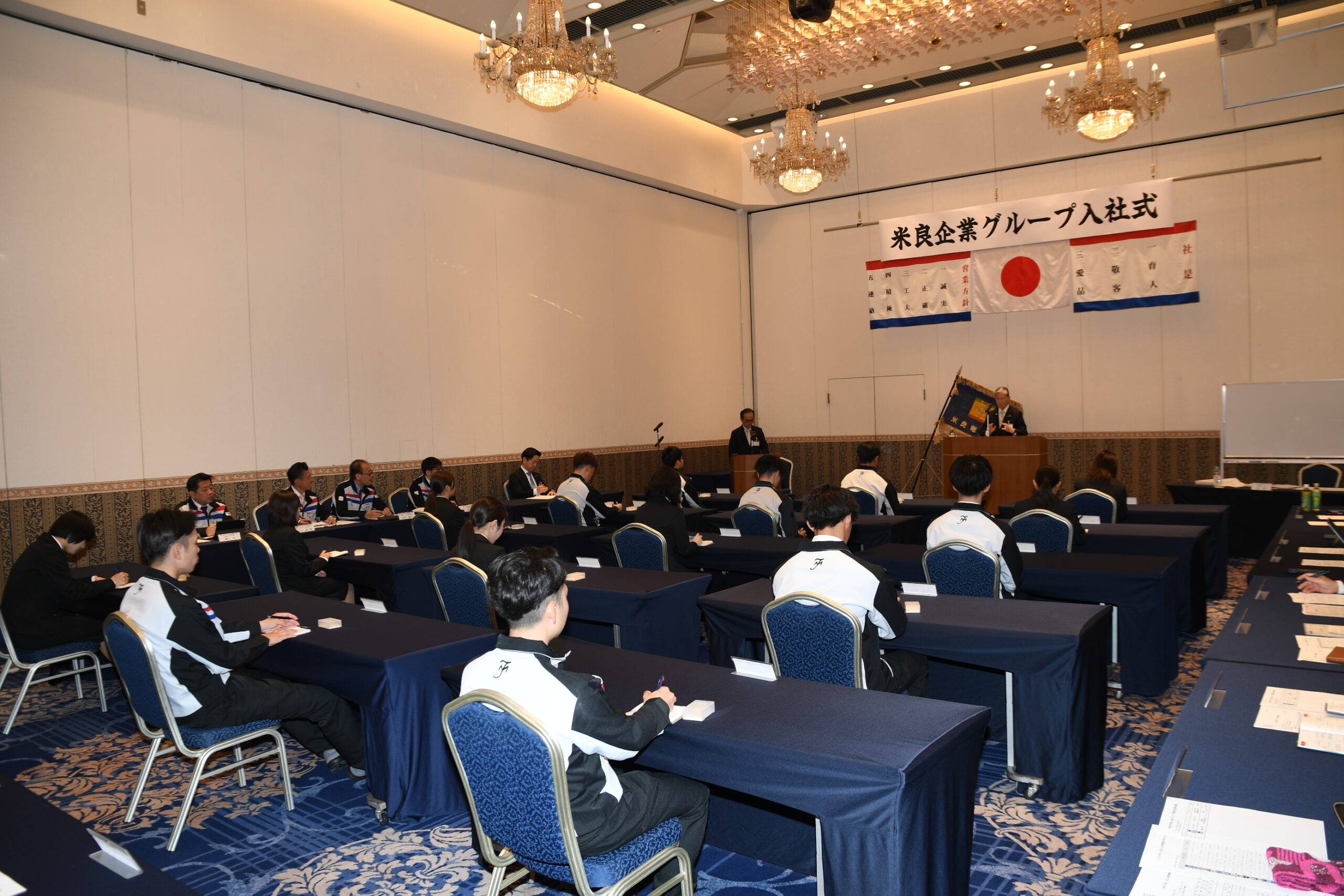 米良充典会長は「当社の新しい仲間として15名の方をお迎えできたことを大変嬉しく思います。わが社を選んでいただいたことに感謝しています。昭和、平成、令和と我々の世代は3つの時代を生き抜いてきました。これからも企業を続けていきます。世代が変わると色んな事が変化しているとよく言われますが、人との繋がりというものは、どの時代も変わるものではありません。学校や友達、ご両親から色んなことを学んできたと思います。ぜひその学んできたことをベースにチャレンジしていただきたい。大いにディスカッションをしていきましょう」と挨拶いただきました。